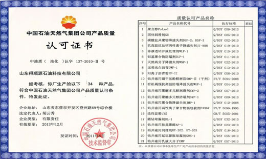 公司建立了先進完善的內控體系和質量控制體系,通過了API spec Q1及API 13A認證、ISO9001質量管理體系認證、14001環境體系認證、18001職業安全健康體系認證、HSE健康安全環保體系認證和CNPC油田化學劑質量認證。